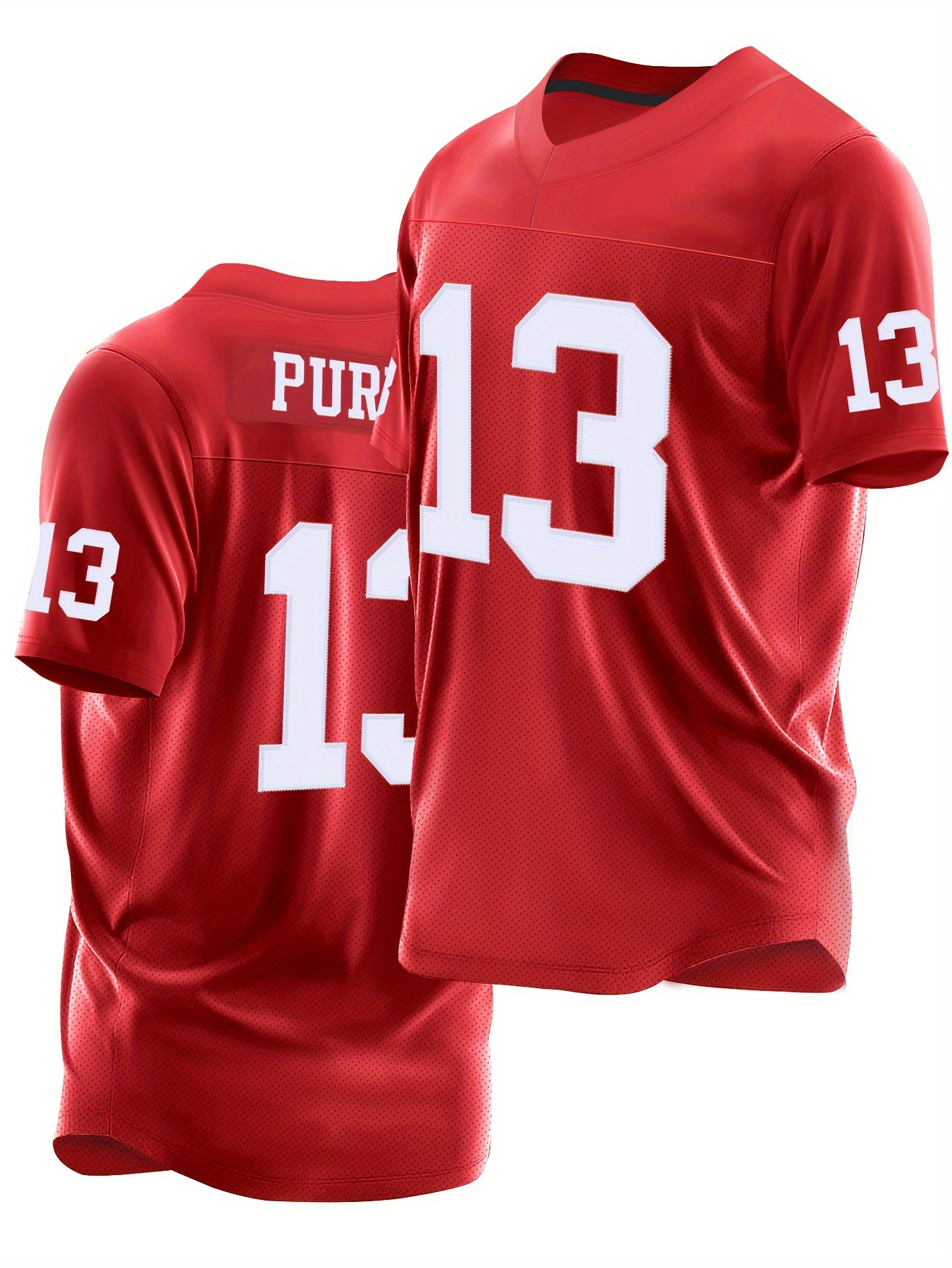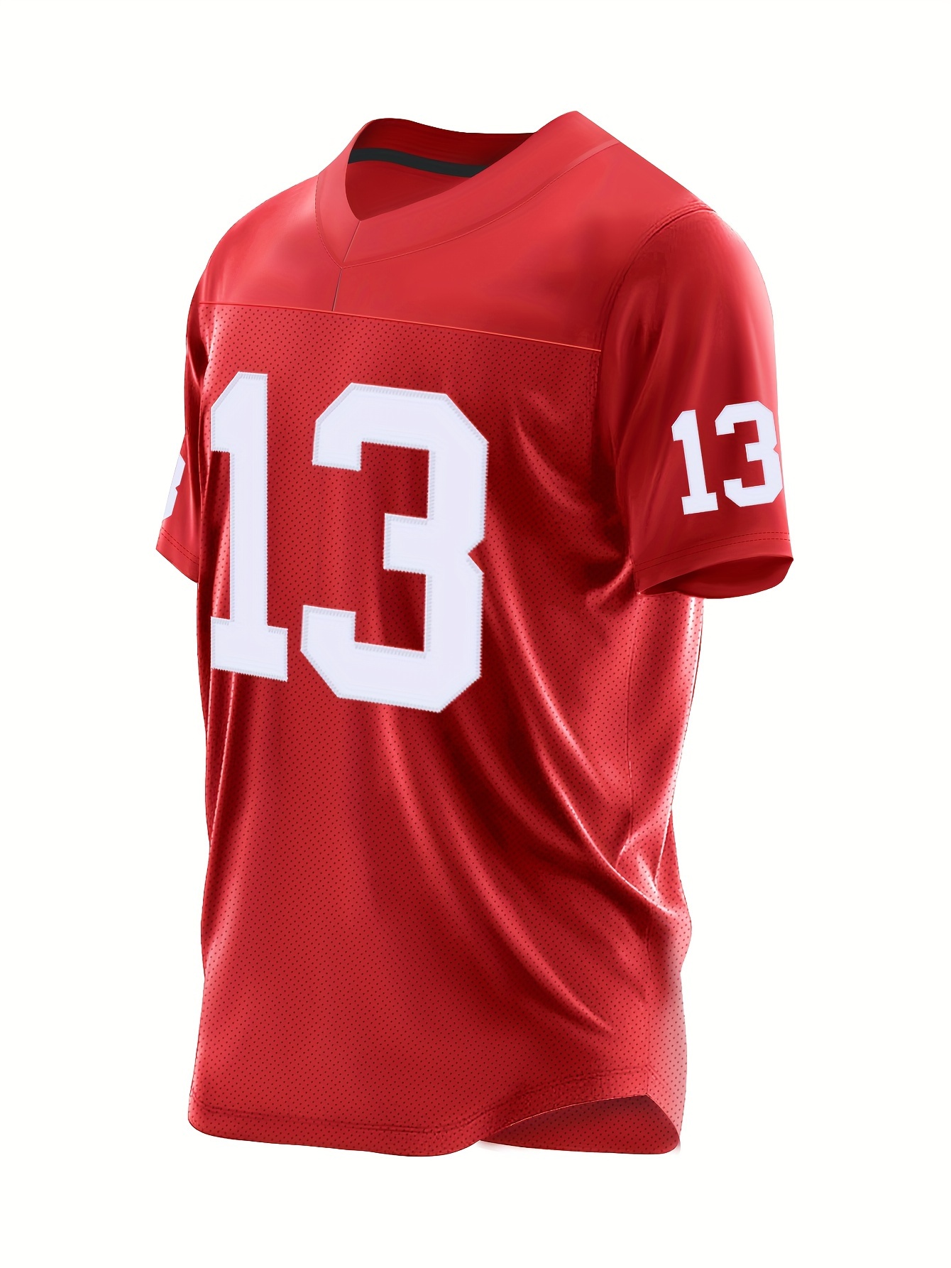 1pc Men'S Red #13 Embroidered Polyester Rugby Top, V-Neck Sports Jacket with Slight Stretch, Breathable Loose Fit for Casual, Outdoor, Hiking & Team Sports - Four Seasons Knit Fabric Shirt
