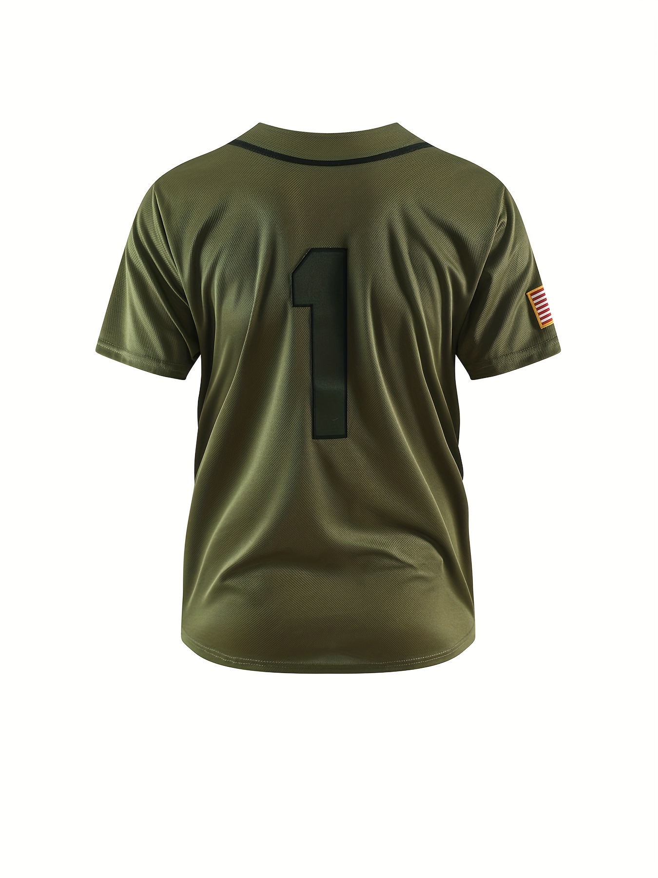 Men's #1 Army Green Baseball Jersey, Breathable Polyester, V-Neck with Button-Up Closure - Sporty & Casual Style for Everyday, Parties, Training & Streetwear