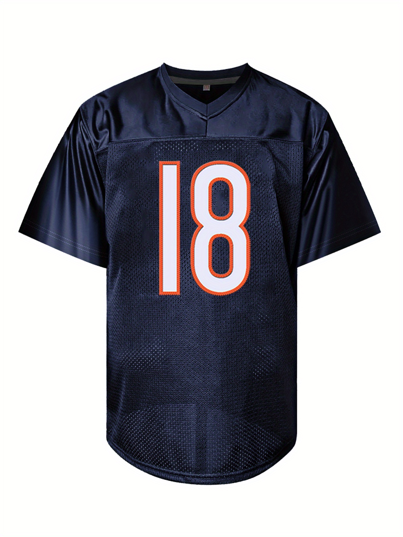 Men's Navy Blue #18 Breathable American Football Jersey - V-Neck Short Sleeve Embroidered Rugby Shirt, Loose Fit All-Season Training & Casual Wear, Machine Washable Sportswear