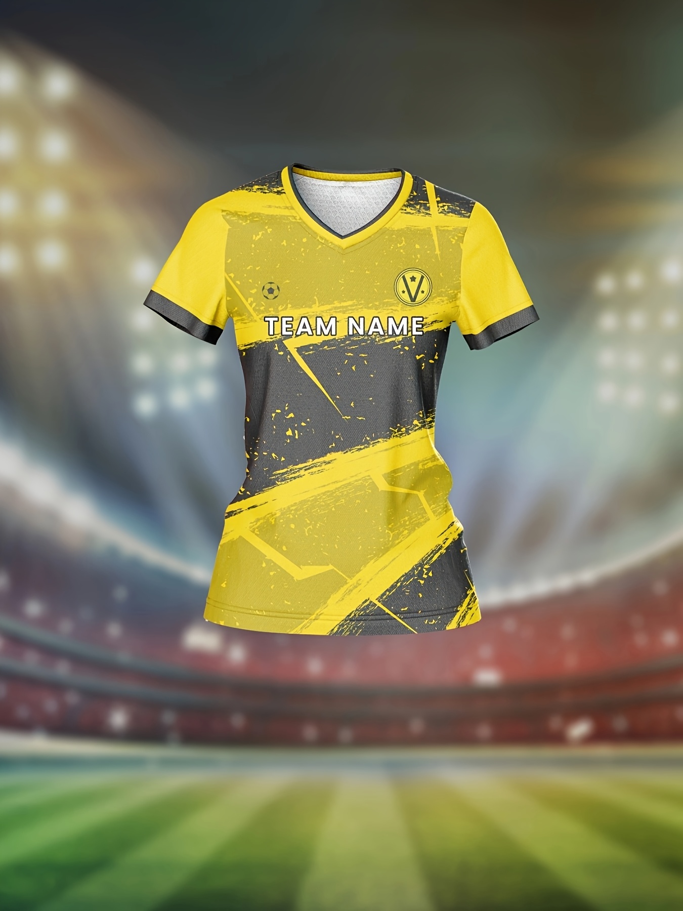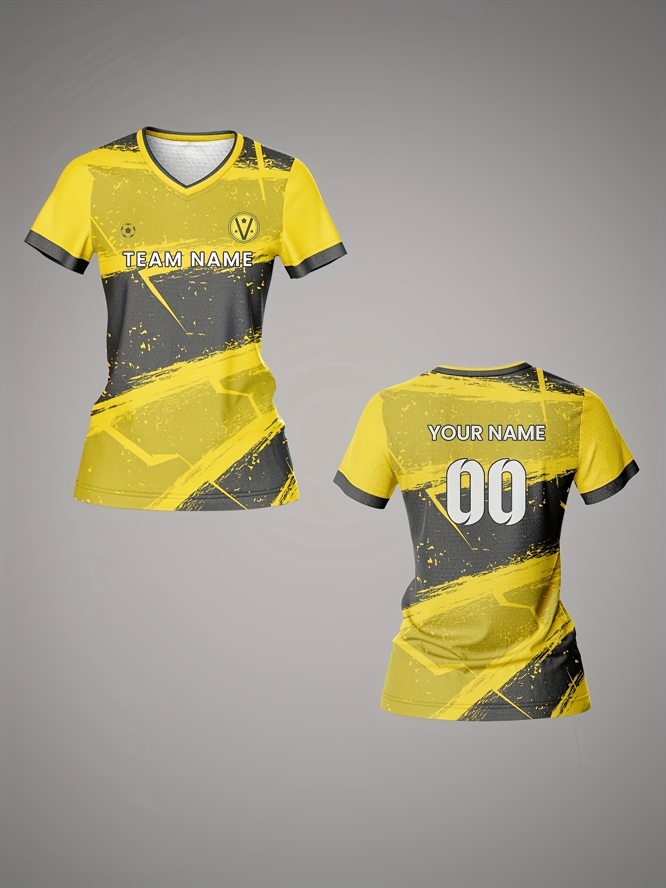 Customized Women'S V-Neck Soccer Jersey with Name & Number - Team Specific Training & Fitness Shirt, Comfortable, Breathable, Quick-Dry for Casual Wear, Yellow & Black Design, Spring/Summer/Fall