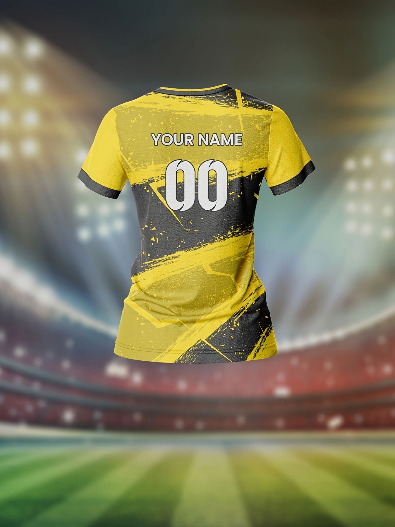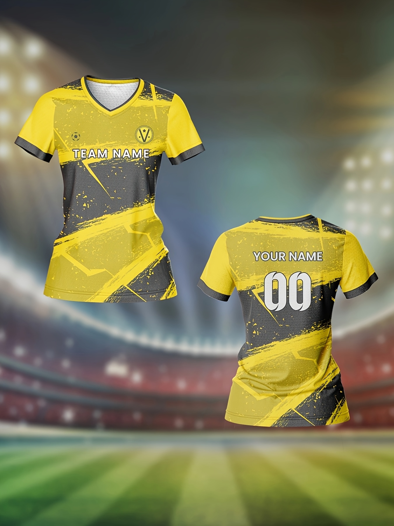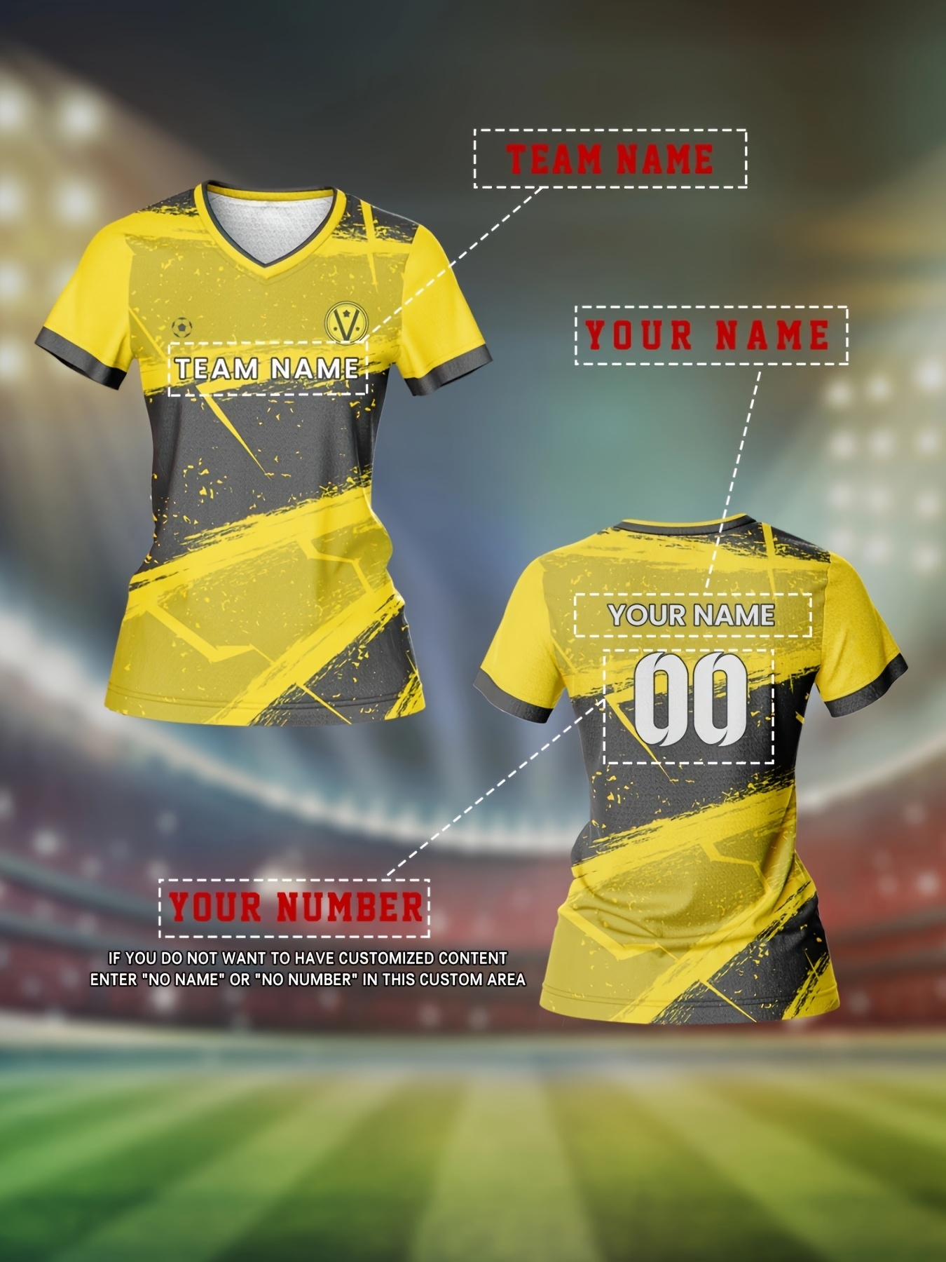 Customized Women'S V-Neck Soccer Jersey with Name & Number - Team Specific Training & Fitness Shirt, Comfortable, Breathable, Quick-Dry for Casual Wear, Yellow & Black Design, Spring/Summer/Fall